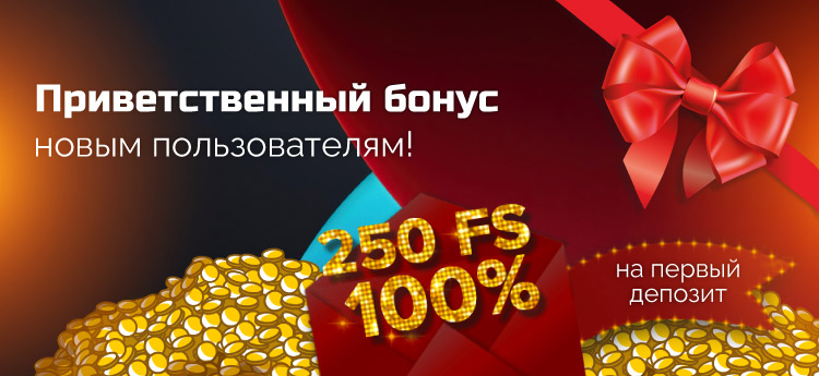 100% + 250 FS на первое пополнение от 2000 рублей или эквивалентной суммы в другой валюте |
